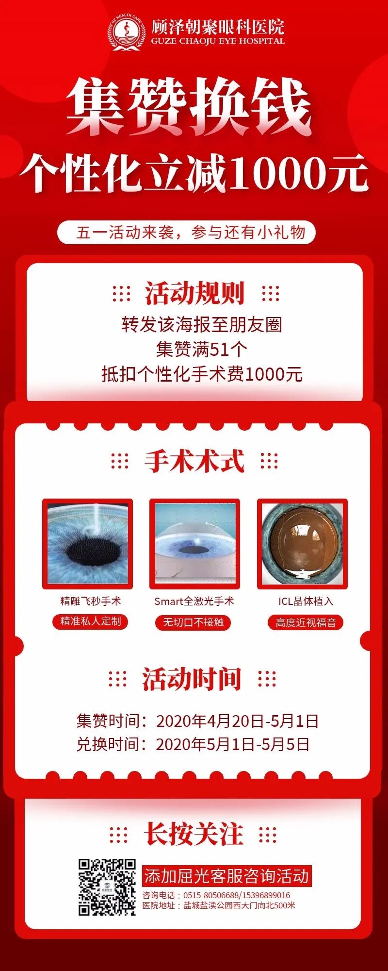 盐城顾泽朝聚眼科医院—医保定点单位 为您提供优质、全方位、富有个性化的医疗服务! 关注朝聚眼科,获取更多健康护眼知识! 联系电话:0515-80506688/15396899016(屈光中心) 地址:盐城人民南路盐渎公园西门北侧500米 长按二维码 关注我们公众号 了解更多眼部知识 长按二维码 进入顾泽朝聚微商城 快捷购买产品和服务