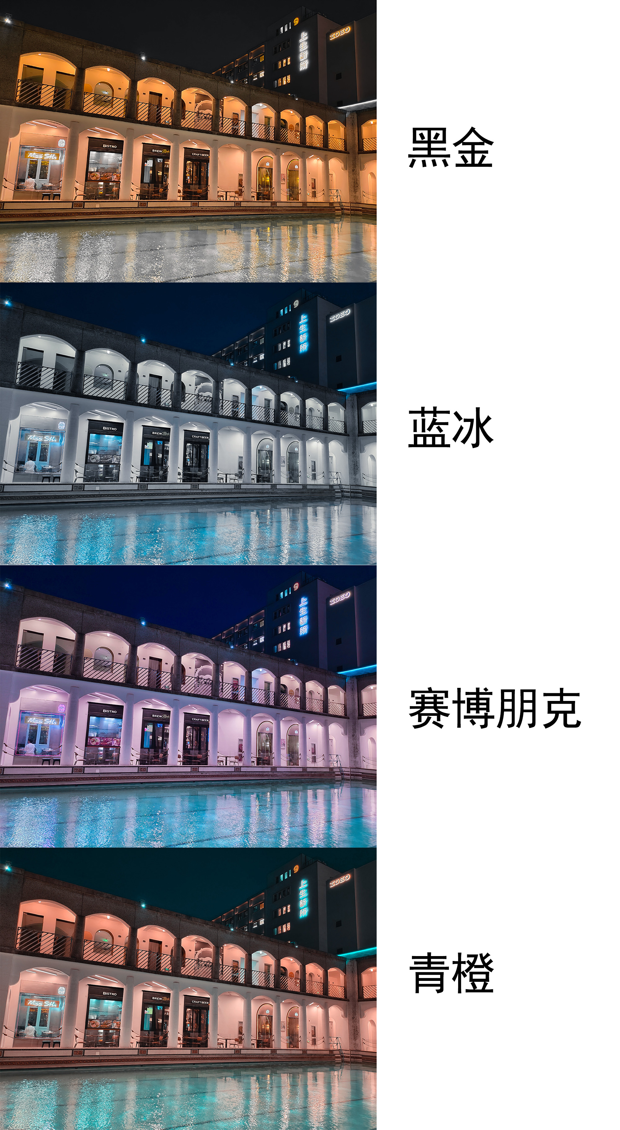 在vivo S7中还内置了4款针对城市夜景制作的风格效果,分别是科技感十足的“赛博朋克”、充满高级感的“黑金”、冰冷的“蓝冰”和时下十分流行的“青橙”。